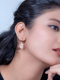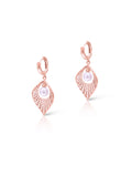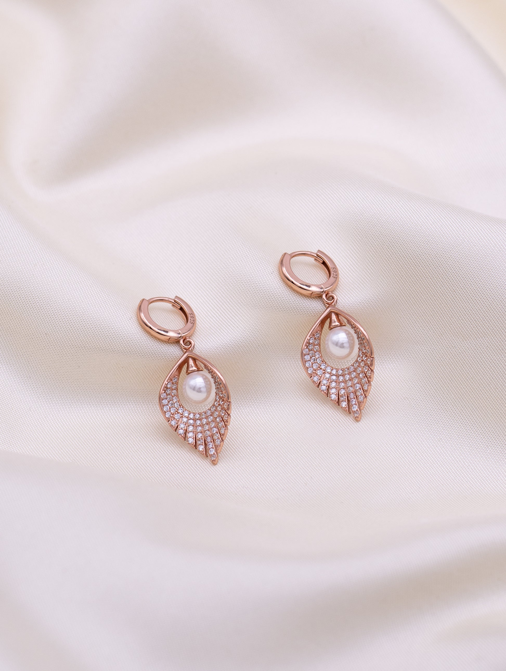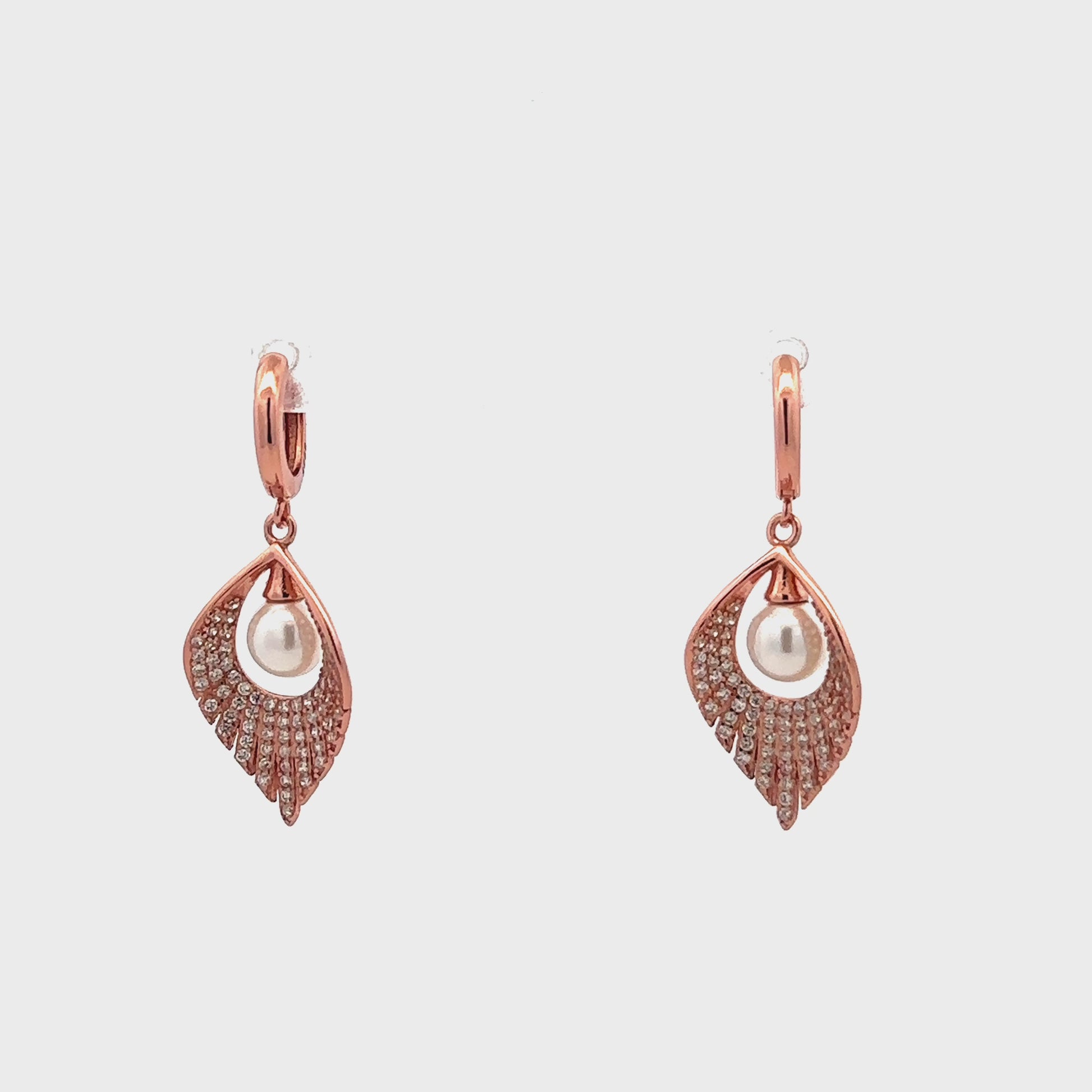 These exquisite earrings feature a stunning design inspired by nature, with delicate leaf-shaped motifs that flow gracefully from the earlobes. The lustrous pearl reflects light beautifully, creating a sophisticated contrast against the soft metallic tones of the rose gold.
